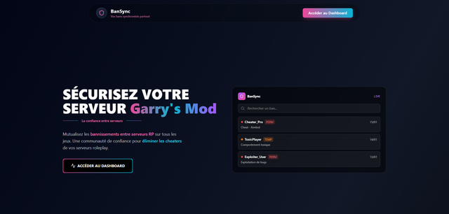 BanSync est un site qui permet au propriétaires de serveurs RolePlay (GMod, FiveM, Arma 3, Rust, Minecraft…) de centraliser et partager les bans sur une base de donnée mutualisée.