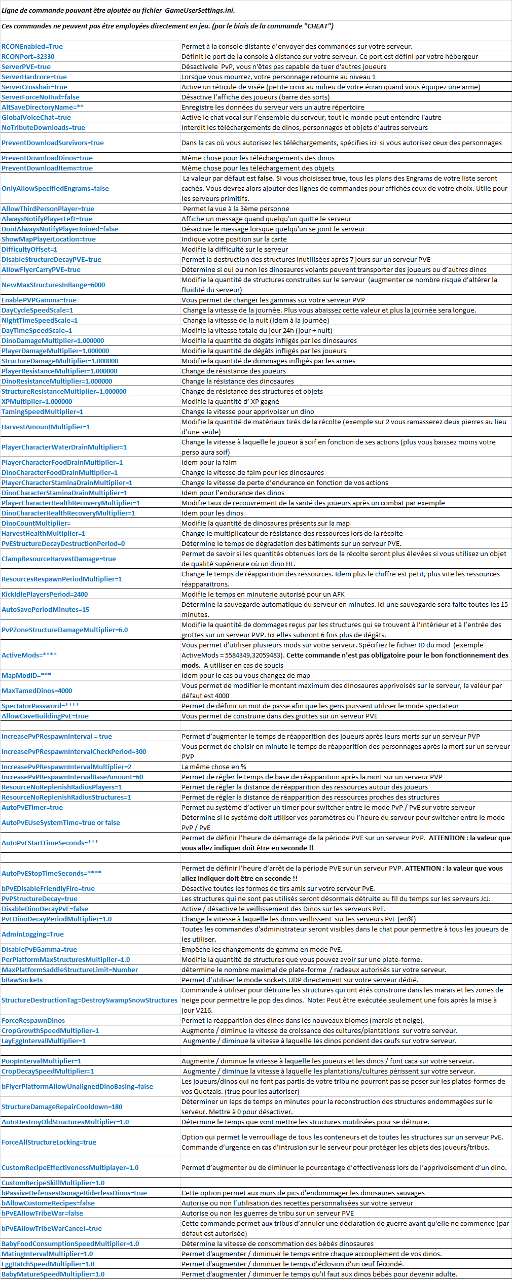 2 - Les commandes que vous pouvez ajouter au fichier GameUserSettings.ini :